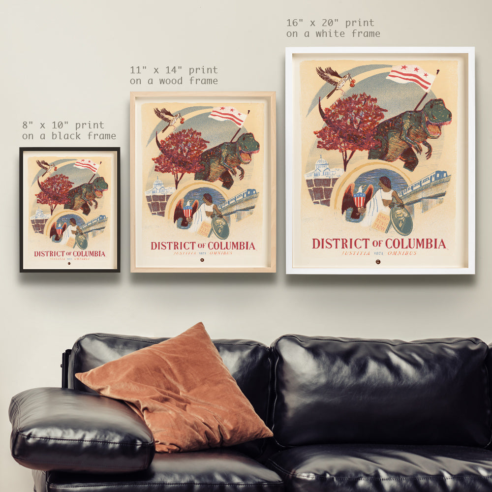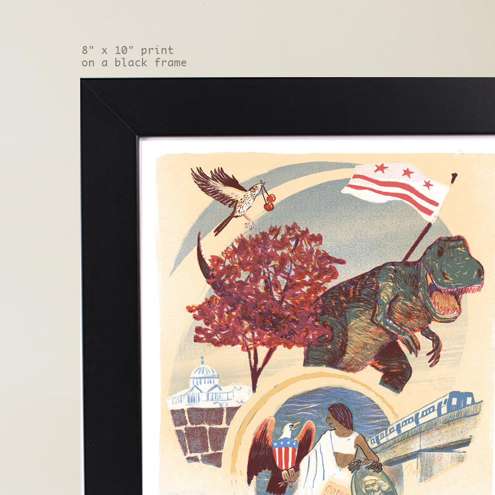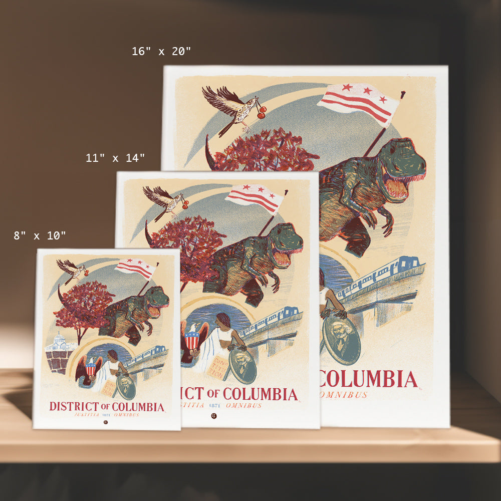 🔴⚪️ Discover the rich history, diverse culture, and natural beauty of Washington DC. through its official symbols. The majestic Scarlet Oak, vibrant cherry, iconic DC flag with its bold red stars and bars, friendly Capitalsaurus, DC Seal (with some artistic license), the Wood Thrush, and Potomac bluestone come together to create a vivid portrait of the nation's capital.