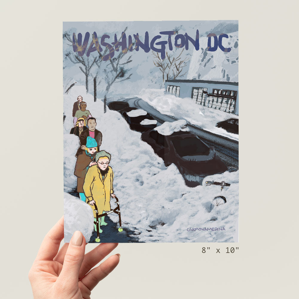 This postcard features neighbors making their way down an Adams Morgan side street, each according to her ability, each according to her need. In the back you can see the faded mural ‘Cows on a Bycicle’ painted by Sara Lee Terrat in a wall on Chaplain st. The mural sparked a community legal brouhaha in the 90s, shortly after it was painted.
