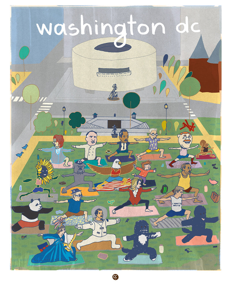 An illustration of the Hirshhorn Museum featuring a diverse cast of DC characters striking a warrior pose beside the iconic, donut-shaped building. Designed by renowned architect Gordon Bunshaft, the Hirshhorn is a celebrated hub for modern and contemporary art, providing a unique platform for artists and art lovers alike. Pedal your way through the nation's capital and immerse yourself in the captivating world of art and culture at this Smithsonian treasure! 🧘